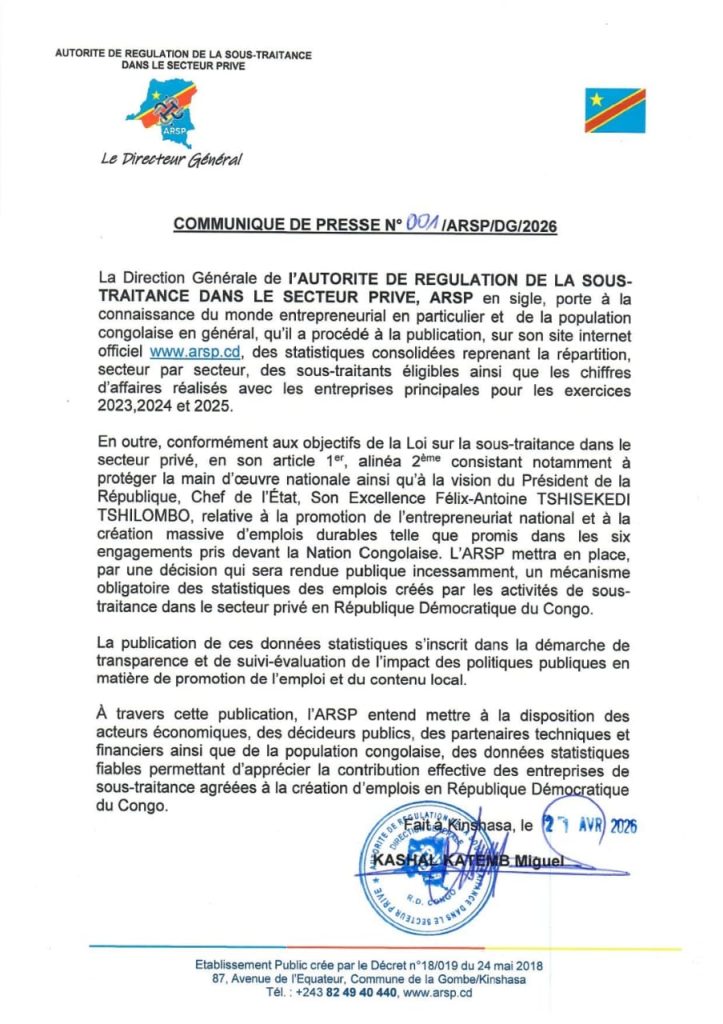 Dans cette perspective, l’ARSP annonce également la mise en place imminente d’un mécanisme obligatoire de collecte des statistiques relatives aux emplois générés par les activités de sous-traitance. « Ce dispositif permettra de mesurer de manière précise l’impact réel de la sous-traitance sur la création d’emplois en RDC », souligne le communiqué. Une évolution jugée essentielle pour passer d’une logique de conformité administrative à une évaluation concrète des retombées socio-économiques.